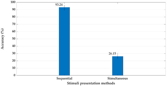In contrast, the average accuracy for the simultaneous method was substantially lower (26.15%). This very large difference clearly demonstrates that the presentation order of the vibrotactile patterns greatly affects accuracy (Figure 5).