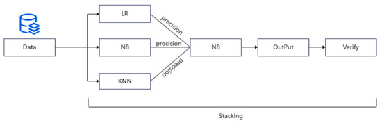 After comparing the stacking of various algorithms, we found that when the first layer is LR, NB and KNN, and the second layer is NB, the algorithm has the best effect. Moreover, we believe that since only a single algorithm is prone to overfitting and other problems, the advantages and disadvantages of each algorithm can be balanced by the stacking model. In addition, since the principles of LR, NB and KNN algorithms are different, the results obtained are less relevant, while NB algorithm is more effective in dealing with algorithms with low correlation, so the second layer uses NB algorithm for processing better. The flow chart of the algorithm is shown in Figure 1.
