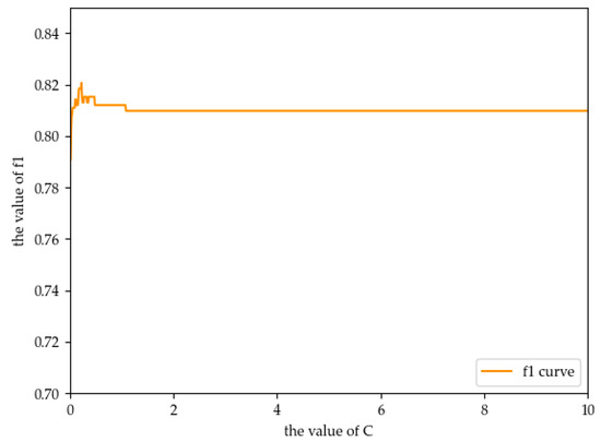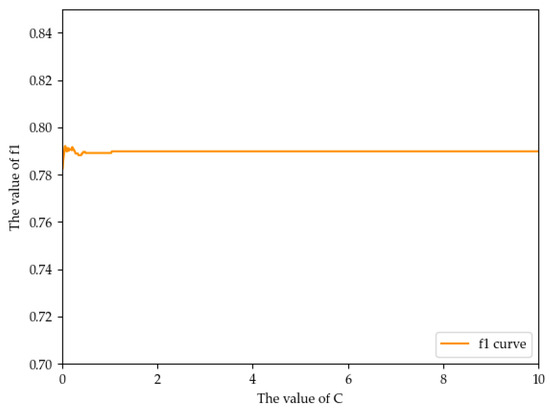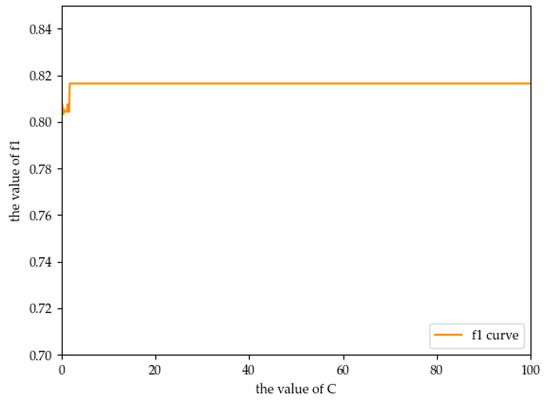 According to Table 6, linear is the appropriate kernel attribute. As the value of attribute C cannot be judged according to Table 6, this study uses the method of traversal to add the value from 1 to 300 to calculate the value of F1, respectively, as shown in Figure 7.