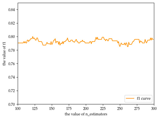As can be seen from Table 4, the probability of max_depth being 7 is 70%, so we believe that 7 is the best max_depth attribute. Therefore, only the n_estimators are searched using traversal in this study. According to Table 4, we can also see that all n_estimators are in the range of 100 to 300, so we set the value range of n_estimators to be between 100 and 300 for a traversal search. The results are shown in Figure 5.