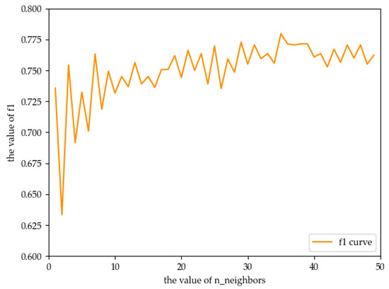 Table 5 shows that n_neighbors is between 1 and 50, and 80% of the algorithm is brute. Therefore, we set the algorithm to brute and iterate n_neighbors between 1 and 50. The results are shown in Figure 6.