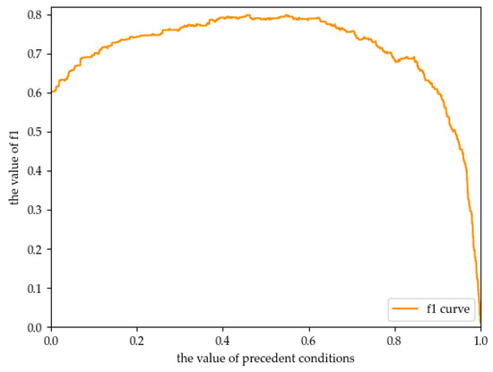 From Figure 8, we can conclude that F1 has the largest value when the precedent condition attribute for non-social phobia is 0.4552. Therefore, in this experiment, we set the attribute value of the precedent condition, which is not social phobia, to 0.4552.