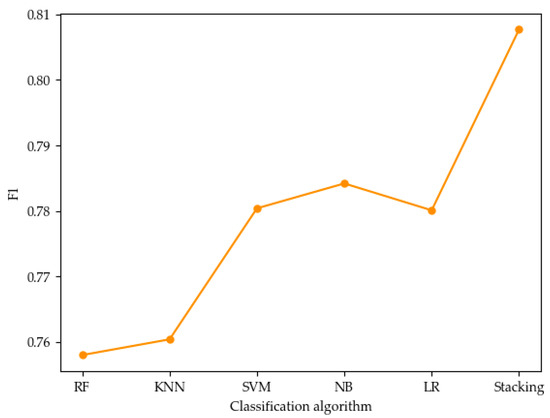 To compare various algorithms more comprehensively, we calculated the average value of the F1 results of each algorithm after 10 cross-validations, as shown in Figure 9. It can be seen from Figure 9 that the average value of F1 in the stacking algorithm is higher than that in other algorithms.