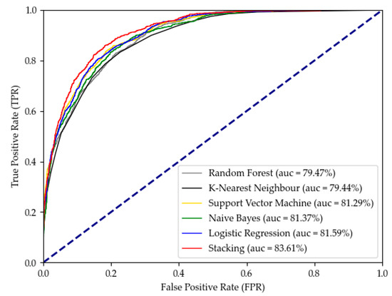 Figure 10 shows us the average value of AUC results after 10 cross-validations of each algorithm. According to Figure 10, it can be concluded that the ROC curve of the stacking algorithm is significantly higher than that of other algorithms. This also indicates that the effect of our proposed stacking algorithm is better than other stacking algorithms.