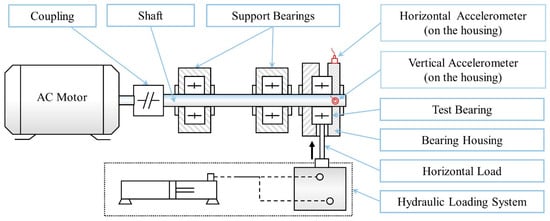 The schematic diagram in Figure 1 shows the overall setup of the bearing rig in [7], where the test bearing is installed at the end of the shaft and loaded from the horizontal direction using the hydraulic loading system. From the healthy condition to the failure threshold specified as ten times the acceleration amplitude of the healthy stage, test bearings operating under three speed and loading conditions are available for analysis. For reference, the specifications of the analyzed data are provided in Table 1. Further details on the bearing data can be referred to in [7].