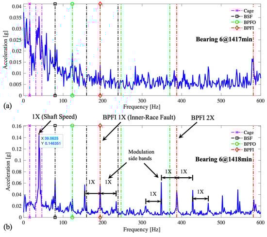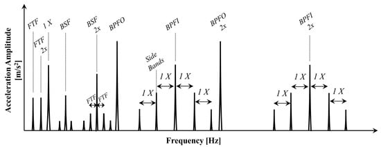 The spectral patterns of the envelope spectrum can differ due to the varying formations of amplitude modulation in different bearing faults. Based on the presence of the FCFs in the envelope spectrum, different types of bearing faults can be identified. A schematic illustration of the envelope spectrum is shown in Figure 2. For example, the impact stroke by the inner-race fault will be modulated by the shaft speed due to the fault entering and exiting the load zone within one shaft revolution. Thus, the BPFI and its higher-order harmonics are accompanied by a series of side bands at the integer multiples of the shaft speed. For roller-element faults, the even harmonics of BSF dominates the envelope spectrum as the fault strikes both inner and outer races in one ball spin [26]; meanwhile, it is modulated by the cage speed (FTF). On the above basis, spectral inspection is conducted on the AES for robust detection and identification of early bearing faults.