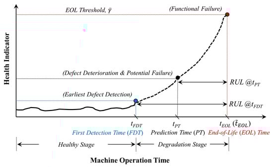 As the RUL is a dynamic variable dependent on the current health condition, the prediction of RUL at the healthy stage may be untenable. On the other hand, the rate of fault deterioration is not known in advance and is often increasingly fast due to the accumulation of historical defects. To allow the optimal predictive maintenance planning, the inspection window between the FDT () and the PT of RUL () is expected to be as short as possible to enable timely prediction of RUL at the early degradation stage.
