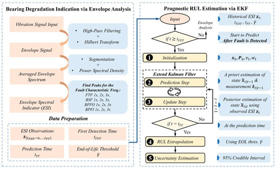 In this section, the overall methodology for the RUL prediction of bearings is presented. First, the envelope analysis with the averaging operation is introduced for the robust identification of bearing faults, based on which the envelope spectral indicator (ESI) can be formulated to reveal the bearing deterioration condition. Once a fault is detected in the bearing, the Bayesian filtering approach based on the extended Kalman filter is further utilized for RUL estimation at the early degradation stage.