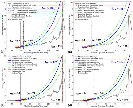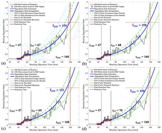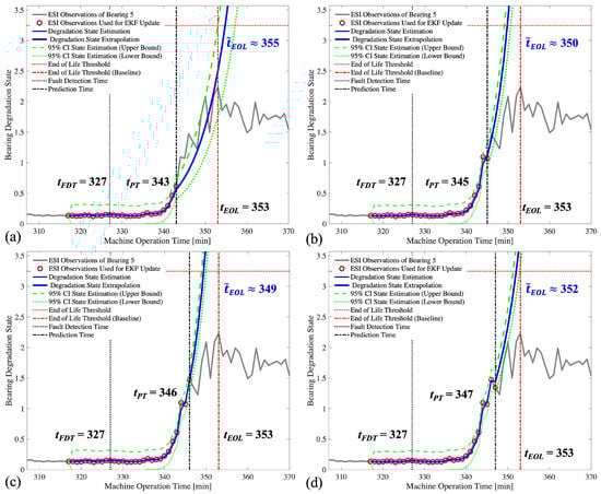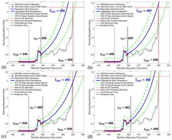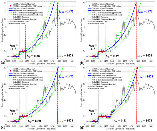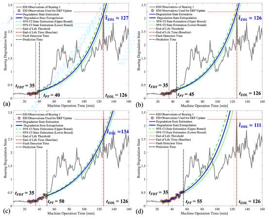 After initializing the model according to Section 3.4.4 and setting the noise levels empirically as , , the EKF algorithm is implemented for degradation state estimation until the prediction time , at which the estimated failure time is predicted based on the state extrapolation and the average EOL threshold . Figure 10a–d show the extrapolation results of the bearing degradation state at four prediction times: the 40th, 45th, 50th and 55th minutes, which are, respectively 5, 10, 15 and 20 minutes after the fault detection. It can be observed that the estimated EOL time, , in each prediction is closely in the vicinity of the baseline, .