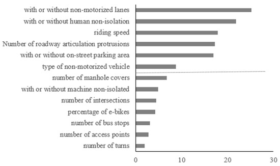 The variables were ranked based on their significance, in descending order: with or without non-motorized lanes, with or without human non-isolation, riding speed, the number of roadway articulated protrusions, with or without on-street parking area, type of non-motorized vehicle, number of manhole covers, with or without machine non-isolated, number of intersections, percentage of e-bikes, number of bus stops, number of access points, and number of turns (see Figure 2 for details).