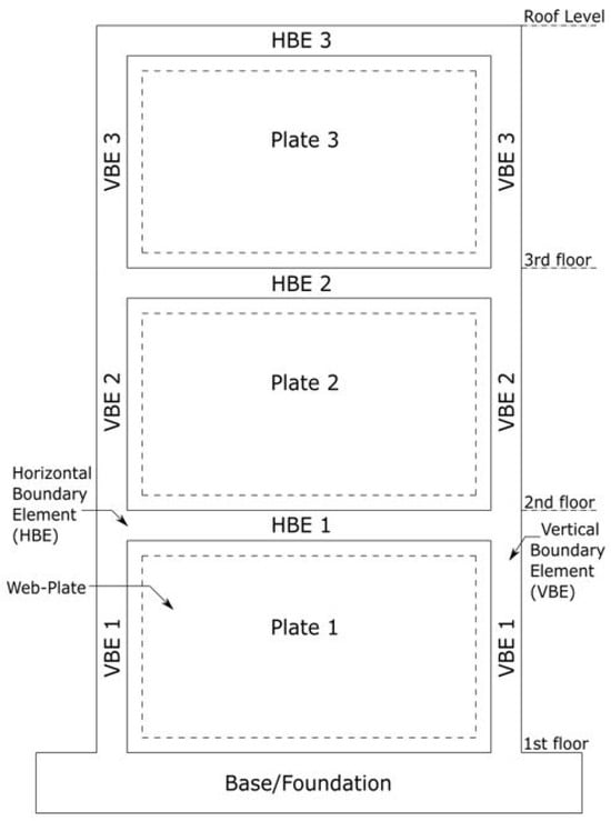 A typical SPSW system, shown in Figure 1, consists of a thin steel web-plate with a common thickness ranging from 5 to 25 mm, two boundary columns, and horizontal boundary beams []. The boundary columns are called vertical boundary elements (VBE), and the beams are called horizontal boundary elements (HBE). With respect to terminology, in steel structures, the term SPSW is used if standard steel sections are employed as HBEs and VBEs. However, when referring to a r/c frame, two configurations can be accomplished: (i) in the first one, a metal sheet or plate is inserted between the existent r/c beams and columns that essentially play the role of the HBEs and the VBEs; (ii) in the second one, the steel plate is inserted between added steel columns (HBEs), implying that the resulting SPSW does not occupy the entire bay span of the r/c frame. Taking into account the relevant literature for both configurations (i) and (ii) studied in the following, it is decided for reasons of uniformity to keep the term SPSW.