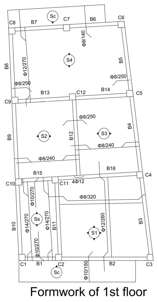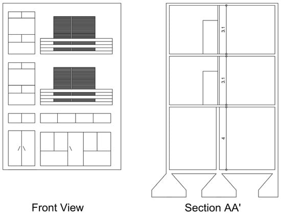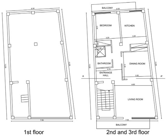 The r/c building under study is a 3-story building located in Amaliada, Greece, and its design was carried out in 1976 on the basis of the requirements of the 1959 seismic code []. A common characteristic of r/c buildings designed by this seismic code is their poor ductile behavior and, in many cases, the scarcity of enough transverse (shear) steel reinforcement for columns. Thus, r/c buildings designed according to [] cannot conform to ductile seismic requirements [,] unless a case-dependent seismic upgrade strategy is employed. The whole set of architectural plans and formworks was available at the time of this study and it is indicatively shown in Figure 2, Figure 3 and Figure 4. According to Figure 2 and Figure 3 and more specifically section AA’, the building has an asymmetrical floor plan and a total height of 10.65 m. The first storey is 4.15 m high, while the second and third storeys have a height of 3.25 m each.