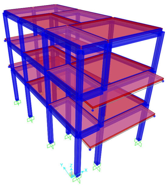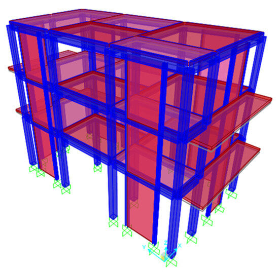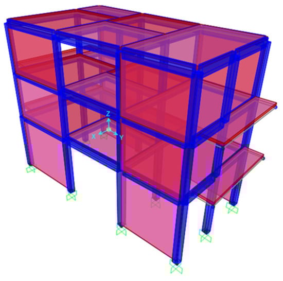 On the basis of the data presented in the previous section, a numerical model of the r/c building was created in SAP 2000 [], and it is shown in Figure 5. In this model, frame elements are used for beams and columns and shell elements for the floor slabs. Concrete cracking is conservatively taken into account by considering for all members an effective stiffness equal to 50% of the gross stiffness. The position of the staircase is found not to be critical for the seismic response of the r/c building, and, thus, it is not included in the numerical model. Infills are included in the model, but only as loads to the beams. The r/c building is assumed to be fixed-base (base fixity is denoted with green symbols in the figures that follow), and, hence, soil-structure-interaction effects are absent.