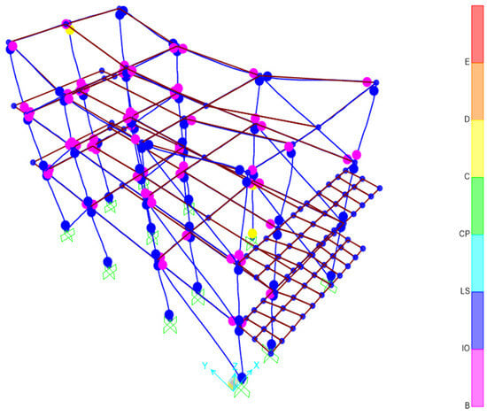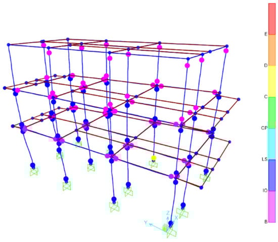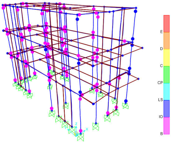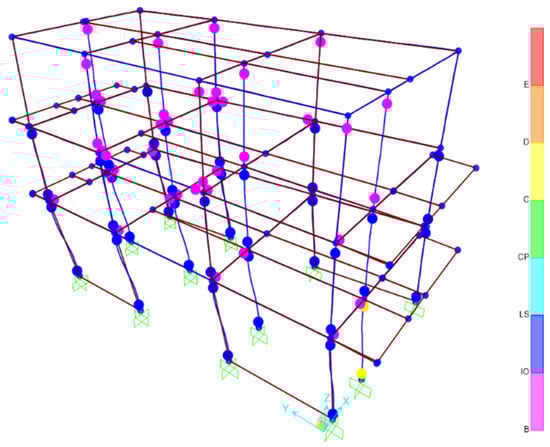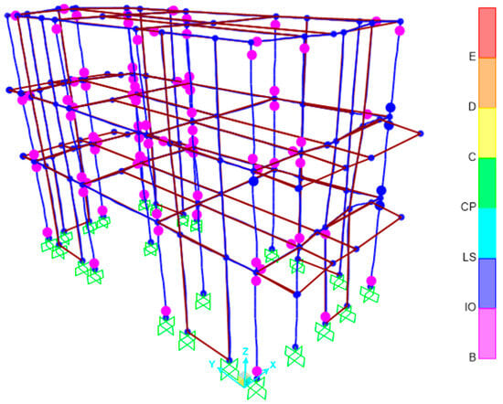 The results of the retrofitted building shown in Figure 9 are described next. The maximum values for IDRs, RIDR, and base shear are listed in Table 7, and in comparison to the results presented in Section 3 (for the non-retrofitted building) and the previous model (Figure 8), the maximum RIDR is drastically decreased to 0.036% < 0.5% and the maximum base shear reduces to 2066 kN (i.e., by 23%). The inelastic behavior of the building is improved, and as revealed by the plastic hinge excursions shown in Figure 12 (worst case), plastic hinges to columns for all six NLTH analyses performed remain below the range defined by the LS.