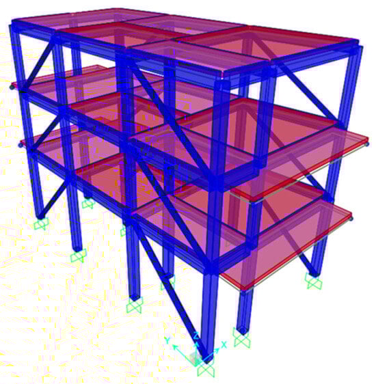 where θ is the angle between the vertical and longitudinal axes of the equivalent diagonal brace, L is the distance between the centerlines of the VBEs, and Ωs = 1.2 is the system overstrength factor. The resulting brace sections are assumed to be of CHS type, and the resulting sections are CHS 273/16 for the first storey and CHS 244.5/16 for the second and third storeys. The model of the r/c building with SPSWs modeled by equivalent braces is shown in Figure 7. The fundamental period of the r/c building in Figure 7 is Τ1 = 0.739 s.