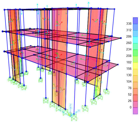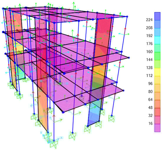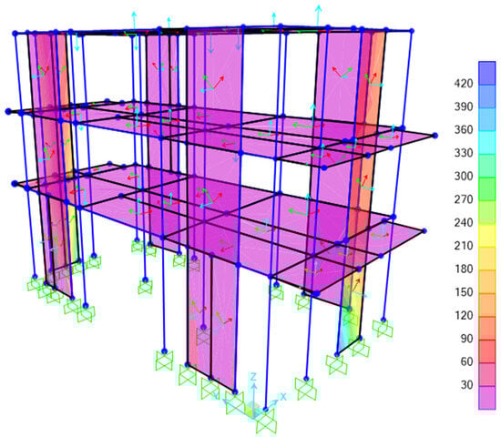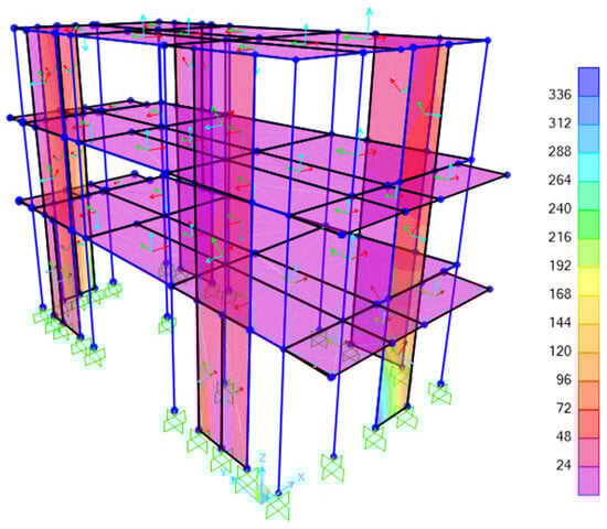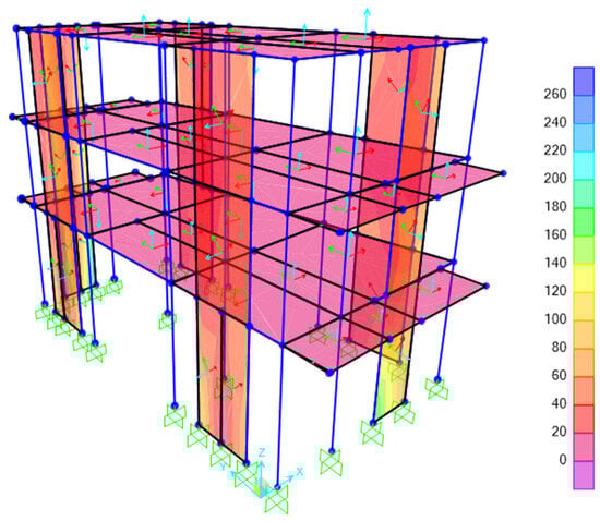 Each SPSW is simulated by shell elements. The thickness of the shell elements is that found above by the application of Equations (1) and (2), i.e., tw = 5 mm. This model is shown in Figure 8. The VBEs needed for the SPSW are essentially offered by the r/c columns to which an additional one-sided steel sheet or plate is attached. The fundamental period of the r/c building in Figure 8 is Τ1 = 0.773 s.