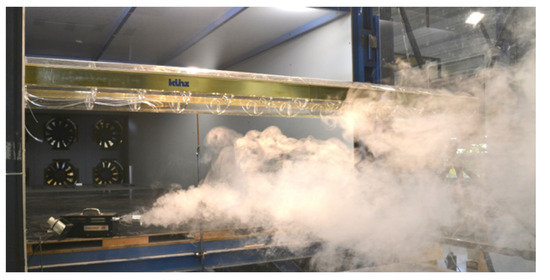 The new design was developed to save weight and simplify production, thus creating a more cost-effective design. Significant improvements were possible by choosing the cross-section shown in Figure 2. Those improvements are discussed briefly. Cranes’ operations at container terminals occur mainly in locations near the sea. Consequently, one desired improvement resulting from the new design is reducing the area exposed to the wind compared with the box-type design. Research partners from academia and specialized consultants strongly supported improving the aerodynamic behavior in the design process. In the first step, an external designer assisted in calculating the improved aeroelastic parameters through a computational fluid dynamic analysis (CFD). In the second step, the associated design parameter was confirmed by scaled wind tunnel tests at RWTH Aachen University [27]. Figure 3 shows one of the scaled models in the wind tunnel.