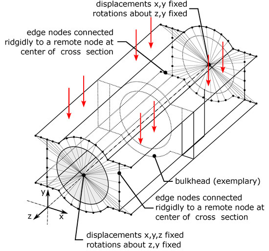 After applying the scaled deformation state, it could be observed that the resulting buckling resistance was relatively high compared with the GMNA’s result, which means that this imperfection pattern is not damaging. The reason for this is the relationship that exists between the global deformation at collapse (bending of the whole component) and the deformation in the region near the bulkheads, which is smaller. Consequently, if the maximum deformation is scaled to fit to the derived amplitude , the result is more or less the deformation of the whole structure due to global bending, and the effect of the local imperfections at the bulkheads is negligible. No severe reduction in the load bearing behavior results from this combination of imperfection pattern and maximum amplitude.