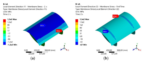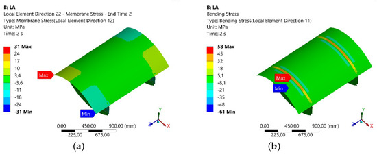 To determine the linear elastic stress field of a reference loading state, a linear analysis (LA) was performed, presuming linear elastic material behavior as well as small deformation theory. The resulting membrane stresses in the meridian and circumferential direction, as well as bending and shear stresses, are shown in Figure 6 and Figure 7.