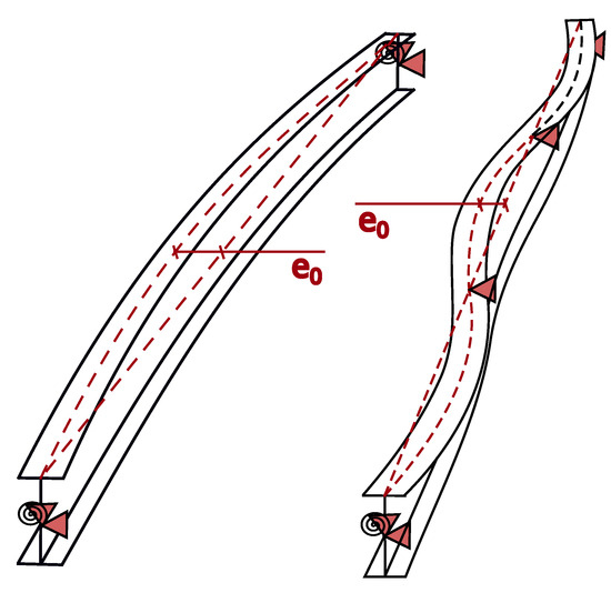 The above-mentioned challenge can be approached in several ways: firstly, one could consider the possible imperfections of the single parts (beams and panels) before joining; or secondly, imperfections on the cross-section could be derived from the manufacturing process, e.g., weld depressions or collapse-affine imperfections of the whole assembly. A third option would be to consider possible imperfections from the single parts before performing welding simulations to obtain a realistic idea of the complete assembly’s imperfections. Given that a GMNIA is already quite an effort, the latter approach would not be practical for assembled parts as the overall complexity of such a procedure should also be considered. Therefore, it seemed reasonable to use so-called substitute imperfections at the components or assembly level. I-beams are less challenging than shells if one considers the possible imperfections of the single parts. Typically, the applied imperfections are the scaled eigenmodes of an LBA, where often the first eigenmode is assumed [38] as the most important one. An alternative approach is to use a bow imperfection, for which EN 1993-1-1 [1] provides guidance on the amplitude for lateral and lateral torsional buckling cases.
