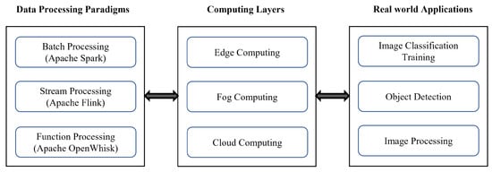 In addition, the requirements of big data processing, such as the training of machine learning models [,,], stream processing [], and event processing [,], raise scalability issues and require significant computing and storage resources [,]. Fortunately, big data management and processing platforms such as Apache Spark [], Apache Flink [], and Apache OpenWhisk [] address these concerns by facilitating distribution and collaboration. In such systems, big data processing tasks are performed using the collaborative power of nodes in clusters. With recent increases in the resource capacity of edge/fog devices and the capability of big data processing platforms, it has become increasingly important to explore the deployment of big data processing platforms on resource-constrained edge/fog devices. The opportunity to combine recent advances in edge/fog devices’ computing capabilities and big data processing platforms motivates the work described in this paper. To address data processing across all computing environments, while previous works have focused on specific data processing paradigms (batch, stream, or function processing) [,,,,,,] and the capabilities of resource-constrained devices [,,], our research addresses the need for a comprehensive examination of the performance of these platforms across three paradigms: batch processing, stream processing, and function processing. This comprehensive approach, coupled with the inclusion of various applications, such as image classification, object detection, and image resizing, adds a layer of comprehensiveness to the evaluation. This work helps to elucidate the efficiency gains and potential benefits that the collaborative deployment of local computing resources across different computing layers can offer in the field of big data processing. The specific research gap that our work addresses is the need for a comprehensive understanding of big data processing in diverse computing environments, considering different paradigms and applications.