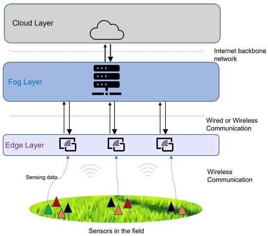 Computing in the edge/fog layer has been introduced to overcome the limitations imposed by centralized cloud computing by performing processing as close to the data source as possible, resulting in a reduction in the round-trip latency when sending data to the cloud and returning the results to IoT devices. It plays an important role in addressing the challenges of real-time and near-real-time data processing and analysis in Internet of Things (IoT) applications. An overview of the layered architecture of edge–fog–cloud computing is shown in Figure 2.