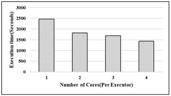 Spark’s configuration parameters, including the executor memory and executor cores, are key parameters in terms of optimizing the performance of applications. The executor memory is the amount of memory allocated to each Spark executor node, and the executor cores represent the number of CPU cores allocated to each executor node, which influences the parallelism and concurrency of the tasks. The executor memory and cores can be adjusted based on the nature of the workload, ensuring that the Spark application performs optimally under varying conditions. As Spark’s performance in the cloud and in clusters of computers has been extensively studied [,], we focused on the most resource-constrained device and performed detailed experiments on the edge-layer Spark cluster. In this experiment, we set the number of executor nodes to four and the memory size to 6 GB. We measured the execution (training) time by varying the number of cores in each worker node from one to four. As shown in Figure 4, increasing the number of cores in each executor significantly increased the performance. Compared with our obtained results shown in Figure 3 and reported in this section, we can observe that training on one node with four cores took 3690 s, and training with four nodes with one core took 2467 s to complete. Training on one node had a longer execution time than with one core each and four nodes under the same executor memory size, which highlights the promising results obtained from the collaborative power of local computing devices when training a machine learning task in a distributed and collaborative way.