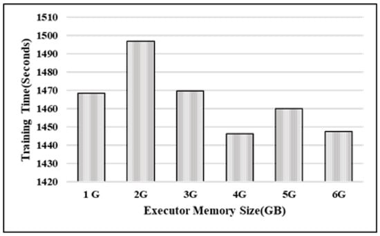 To investigate the impact of the executor memory size on the performance, we measured the training time by varying the memory size of the Spark executor from 1 GB to 6 GB. We set the number of worker nodes to four, and the number of executor cores per node was four. The execution was repeated five times, and in the graph, it is plotted as the average value. As shown in Figure 5, increasing the size of the memory in each executor node did not speed up the execution. In addition, we found that execution with 2G memory took longer than with 1G, and execution with 5G memory took longer than with 4G. Although the image classification application was trained for 1000 iterations using the MLP model, this pattern was not caused by Spark image classification tasks. We observed the memory utilization in five-second intervals using the SAR (system activity report) command in Linux and confirmed that the actual memory utilization in all Spark worker nodes consistently remained below 1 GB throughout the entire execution period. Please note that the parallel training of MNIST classification tasks on Spark worker nodes does not fully consume all allocated memory, and the excessive allocation of memory beyond the necessary amount does not bring about benefits in terms of performance. Thus, we can conclude that increasing the Spark executor memory size cannot guarantee a speedup in a distributed environment. However, the current analysis, we did not specifically incorporate memory-intensive data analytic tasks. The observed patterns in Figure 5 primarily arose from the execution of the image classification training application, and as mentioned above, the actual memory utilization during this execution remained below 1 GB. If we execute memory-intensive data analytic tasks, changing the memory size impacts the system performance. This is particularly important in resource-constrained edge environments, where resources are limited and need to be carefully managed.
