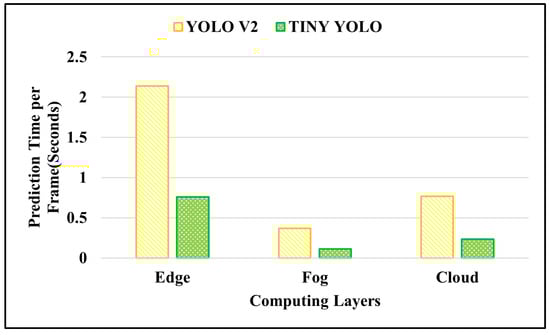 Furthermore, to examine the real-time detection rate in the computing layers, we set the frame transition to 200 milliseconds and measured the number of frames that could be successfully detected and predicted from a total of 5792 frames. As shown in Table 2, the fog-layer detection rate was higher than that of the cloud layer, and the edge-layer detection rate was only 4.49%. In the edge layer, the detection rate was significantly lower compared to the fog layer and cloud layer. We observe that in all three computing layers, all frames could not be detected during real-time video playback. In this case, a message-queuing system such as Apache Kafka can be deployed for the temporary storage and processing of video frames. In addition, the speed requirements for object detection from surveillance cameras vary depending on the specific use case and scenario. In real-time applications such as autonomous vehicles, low latency and high processing speeds are critical in making instantaneous decisions. There are also application scenarios that do not require instant decisions, such as environmental monitoring. Without such information, it is unfeasible to conclude whether a given edge or fog deployment is suitable for the use case in absolute terms.