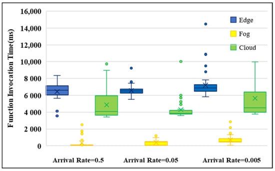 Image processing applications are some of the most widely used serverless applications. The serverless image processing function is triggered when an image is stored or updated in the database or object storage. The image processing application used in this work is adopted from [] and modified to be executed in an open-source serverless platform. As the deployment of the AWS image recognition collection has limitations prohibiting its execution in the edge and fog layers, we adapted the application to include simple image processing functions, namely metadata extraction, metadata transformation, metadata storage, and image resizing. Thus, our adapted application only consists of four image processing functions. The functions are chained together to process a request. In the cloud layer, we used step functions to create a workflow that connects all four functions. For the storage of metadata in the database, in the cloud layer, we used DynamoDB, and in the edge and fog layers, we used CouchDB, which is included in the OpenWhisk platform. We submitted 50 function invocations with a Poisson arrival rate of 0.5. In the cloud layer, a Python script that can invoke the step functions is hosted in an ec2 instance in the same region. We used the latency performance metric to measure the performance of the serverless platform in each layer. Latency directly measures the time taken for a serverless platform to respond to a request. In scenarios where user experience and responsiveness are critical, such as web applications or interactive services, latency is a fundamental metric. Latency is a widely accepted and standardized metric for the benchmarking and comparison of the performance of serverless platforms [,].