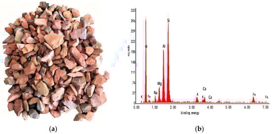 The coal gangue used in this study originates from the Ping’an Mine in Fuxin City, Liaoning Province. This material is characterized by a ceramic red or brick-red colour after cleaning, and it possesses a loose structure. The mineral compositions and micromorphologies are depicted in Figure 1.
