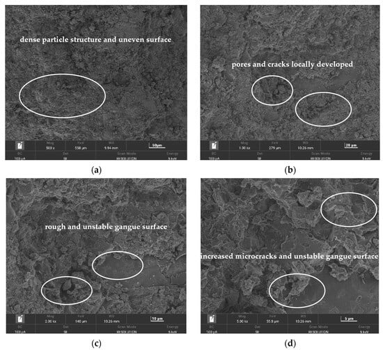 In order to gain a comprehensive understanding of the physical properties of gangue coarse aggregates, we conducted a meso-structural analysis of fractured gangue using field emission scanning electron microscopy (MIRALMS, Czech TESCAN, Brno, Czech Republic). In this experiment, scanning electron microscopy (SEM) is employed, featuring a secondary electron image resolution of 0.9 nm at 15 kV and a backscattered electron image resolution of 2.0 nm at 30 kV. The instrument magnification ranges from 8× to 100,000×. Figure 2 displays scanning electron microscopy images of fractured gangue samples at different resolutions.