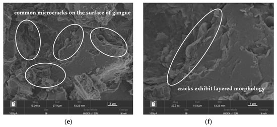 Scanning electron microscope pictures of crushed gangue; (a) 500× resolution; (b) 1000× resolution; (c) 2000× resolution; (d) 5000× resolution; (e) 10,000× resolution; (f) 20,000× resolution.