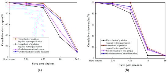 Coal-gangue coarse aggregate gradation curve. (a) 5~20 mm; (b) 5~10 mm.