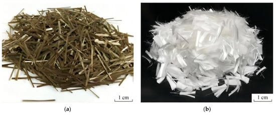 - Both basalt fibre (BF) and polypropylene fibre (PF) exhibit monofilament bundle morphologies. BF is characterized by its deep copper hue, while PF has a silvery-white appearance, as shown in Figure 4. The key properties of BF include a length of 18 mm, a diameter of 15 µm, a density of 2.56 g/cm3, a tensile strength of 4500 MPa, and an elastic modulus of 75,000 MPa. PF has a length of 19 mm, a diameter of 30 µm, a density of 0.91 g/cm3, a tensile strength of 270 MPa, and an elastic modulus of 3000 MPa. Understanding these characteristics is essential for assessing the performance of BF and PF when incorporated into concrete materials.