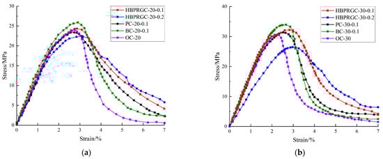 Stress–strain curves of the compression test. (a) C20; (b) C30.