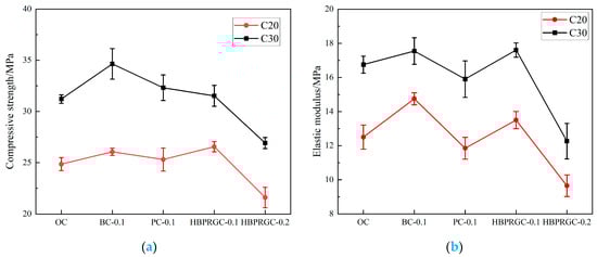 The variation of compressive strength and elastic modulus of HBPRGC. (a) Compressive strength; (b) Elastic modulus.