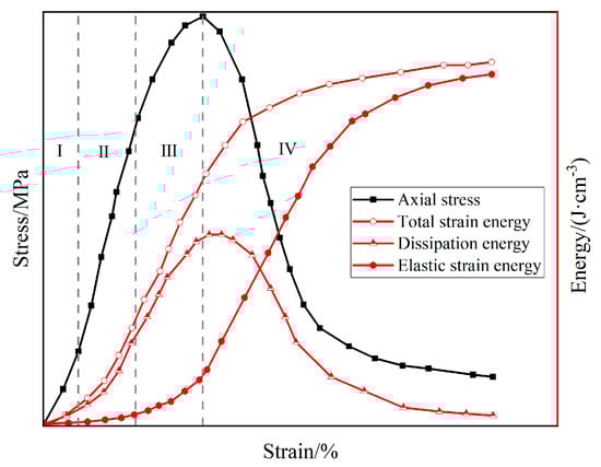 Figure 8 illustrates the stress–strain relationship and energy-evolution characteristics of coal-gangue concrete. The energy-evolution characteristic curve of coal-gangue concrete can be segmented into four distinct stages. (I) Primary crack closure stage: during this phase, the initial load causes the primary crack in the coal-gangue concrete to close, resulting in relatively low total strain energy. No new cracks form in the gangue concrete interior, and the dissipation energy remains low. (II) Linear elastic stage: this stage corresponds to the elastic deformation of coal-gangue concrete, with no formation of new cracks. Consequently, the dissipation energy remains low, and the total strain energy is stored in the coal-gangue concrete in the form of elastic strain energy. (III) Rapid crack expansion stage: new cracks gradually emerge in the coal-gangue concrete during this stage. A portion of the total strain energy is converted into dissipative energy, and the rate of increase in elastic strain energy decreases. (IV) Crack-penetration stage: as soon as reaching the peak stress, the cracks in the coal-gangue concrete progressively extend, forming macroscopic cracks and leading to material failure. During this phase, as the load gradually decreases, the total strain energy increases at a slower rate. The elastic strain energy stored in the coal-gangue concrete is dissipated as a result of crack penetration, leading to a gradual reduction in elastic strain energy and a simultaneous increase in dissipative energy.