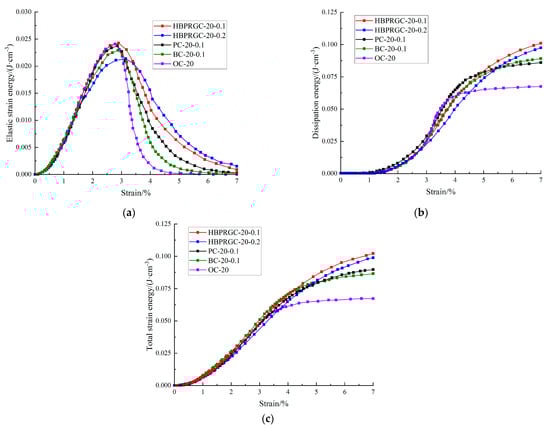 Energy-evolution law of HBPRGC with matrix strength grade of C20. (a) Elastic strain energy; (b) dissipated energy; (c) total strain energy.