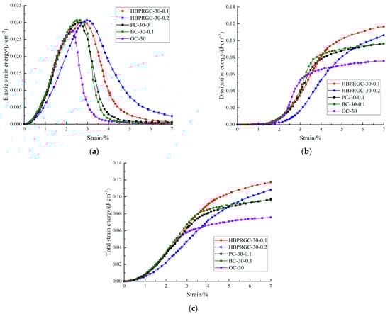 Energy-evolution law of HBPRGC with matrix strength grade of C30. (a) Elastic strain energy; (b) dissipated energy; (c) total strain energy.