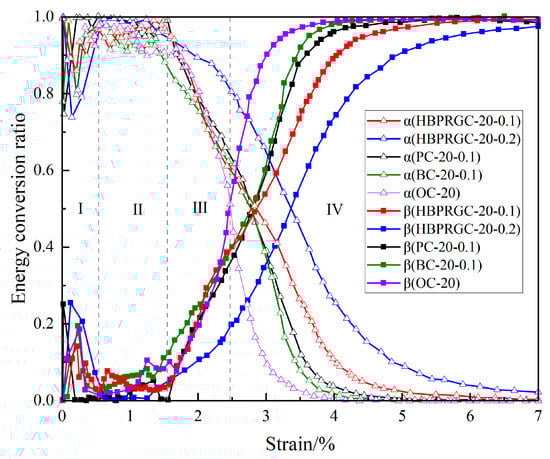 The energy conversion rates of HBPRGC are illustrated in Figure 11; α = Ue/U is defined as elastic strain energy conversion in HBPRGC, and β = Ud/U is defined as dissipative energy conversion. Figure 11 demonstrates that in the closing stage of primary cracks (stage I) when the matrix strength remains constant, the elastic strain energy conversion in HBPRGC decreases to α < 1, while the dissipative energy conversion increases to β > 0.1. This phenomenon is mainly attributed to the energy consumed by primary crack closure due to friction. During the stage of elastic deformation (stage II), the addition of fibre leads to increased internal interfaces within coal-gangue concrete. Consequently, loading induces dislocation and interface friction, resulting in increased energy consumption. Hence, the addition of fibre reduces the elastic strain energy conversion rate and augments the dissipative energy-conversion rate.