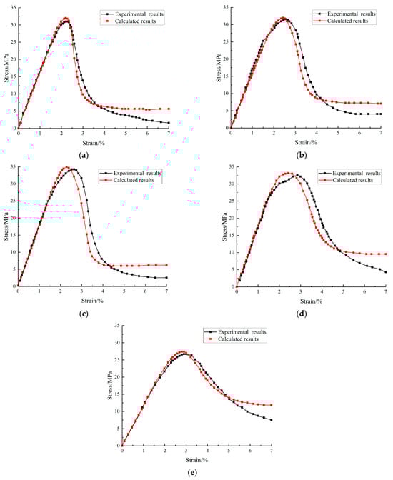 Damage constitutive model and test results fitting curve. (a) OC-30-0.1; (b) PC-30-0.1; (c) BC-30-0.1; (d) HBPRGC-30-0.1; (e) HBPRGC-30-0.2.