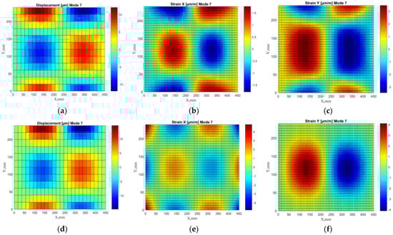 Transverse displacement shapes and strain fields in X and Y directions for 7th mode: experimental (a–c) and numerical (d–f).