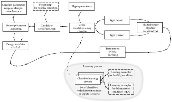 To estimate individual objectives of , the SHM effectiveness through the estimation of classification performance statistics need to be completed. For this purpose, a classifier should be prepared that takes information on the strain values for the given coordinates according to the sensor’s network placement, and returns the information about the health condition of the composite plate. Separately, to avoid using the coordinates of the location of the sensors as design variables, the appropriate method of sensor placement was used internally in this proposed optimization procedure. This allows one to take advantage of the available knowledge on the effectiveness of the selected sensor-placement algorithm used for the composite plate based on the results obtained in [7].