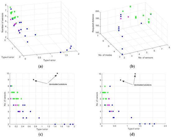 Annotation represents individual solutions of a Pareto front, is the negation transformation function, and represents the subset of Pareto solutions with a cumulative contribution of the top 20% solutions, when all objective functions are taken into account, but with limited influence of the number of sensors represented by weight . Similarly, represents the subset of Pareto solutions with cumulative contribution of the top 20% solutions when the sum of type-I and type-II errors are taken into account, with the limited influence of the type-I error represented by weight . In the present study, the following exemplary weights were assumed, and . These weights can be appropriately estimated for the known costs of sensors and required unbalanced performance toward type-I or type-II errors. The Pareto solutions shown in Figure 4 represented by the magenta-filled circles show the top 20% of solutions for set A, and the green-filled circles show solutions for the weighed sum of the observed type-I and type-II errors represented by set B.