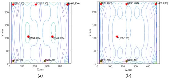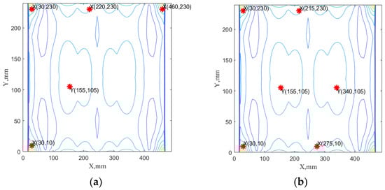 The example of nondominated solutions from Pareto solutions belonging to subset A: (a) the case with 5 sensors, 4 sensors in x direction, and 1 sensor in y direction for the required distance of 188 mm and the first six modes; (b) the case with 6 sensors, 4 sensors in x direction, and 2 sensors in y direction for the required distance of 184 mm. In both figures, sum of first six dominated mode shapes are presented (7th, 5th, 6th, 9th, 4th, 10th) as a background contour plot.
