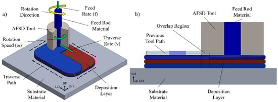 (a) Representative schematic of an in-progress parallel pass AFSD. (b) Section view with overlapping tool path schematic. Red and blue coloration is used to visually distinguish deposition layers.
