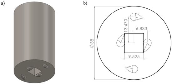 (a) Representative model of the AFSD tool. (b) Dimensioned schematic of the AFSD tool face in mm.