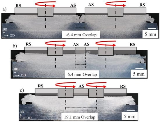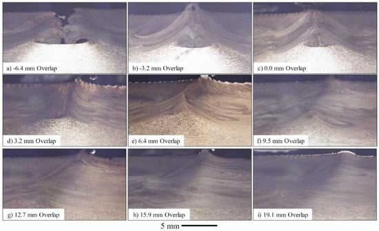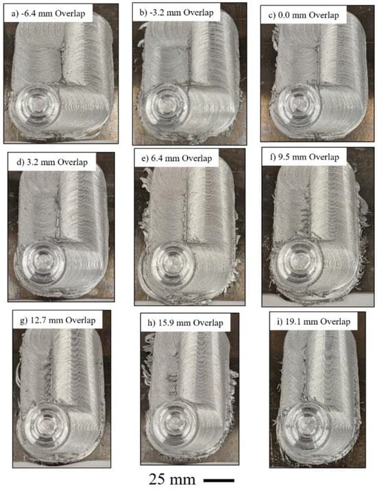 If a component was to be made with a much larger surface area than the depositions from this study, there would be a large difference in the required amount of consumed material between builds using different overlap parameters, assuming all other operating parameters are held constant. A large build using a 6.4 mm overlap (Figure 3e) would take much less material and time, and therefore require lower overall costs, than a build with a 19.1 mm overlap (Figure 3i). A build using a gap between passes instead of an overlap, such as Figure 3a, with a −6.4 mm overlap, would deposit material the fastest and use the least amount of material, but the mixing region between the initial and returning pass would only be connected by the flash material. A greater amount of overlap will have a much higher amount of mechanical mixing and create a more homogenous deposition throughout the multiple deposition tracks at the expense of more material and a longer build time.