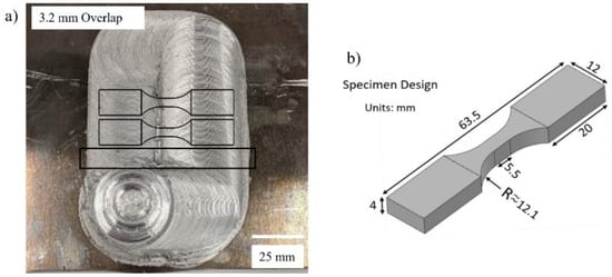 From the builds shown in Figure 3, tensile specimens and cross-section samples were collected for quasi-static tensile testing, hardness testing, and grain size analysis. Figure 4a shows the schematic of a completed build with the original locations of the tensile specimens and cross-section samples. The build shown was deposited with a 3.2 mm overlap, which corresponds to Build D from Table 1 and Figure 3d. The failure location of each specimen was designed to be within the overlap region of the deposition. Figure 4b details the dimensions of the tensile specimens used in the present study in accordance with the modified ASTM E606/E606M-12 standard [40]. Due to the geometry of the tensile specimens and the final depositions, quasi-static results could not be collected for every build.